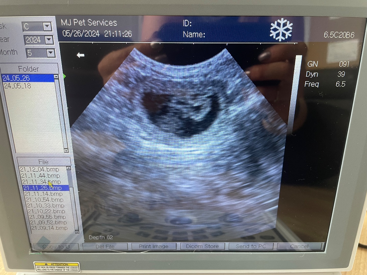 Urgent vet referral scan, no pups, lots of fluid, dog ended up have emergency operation