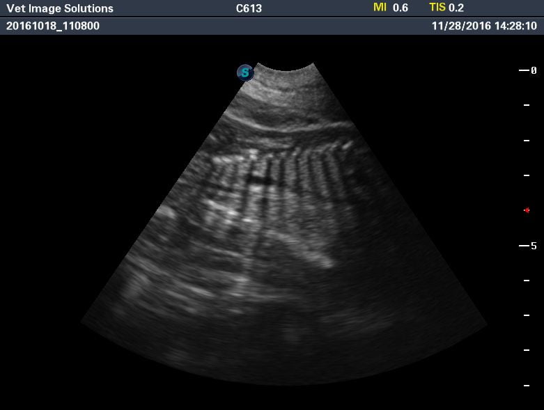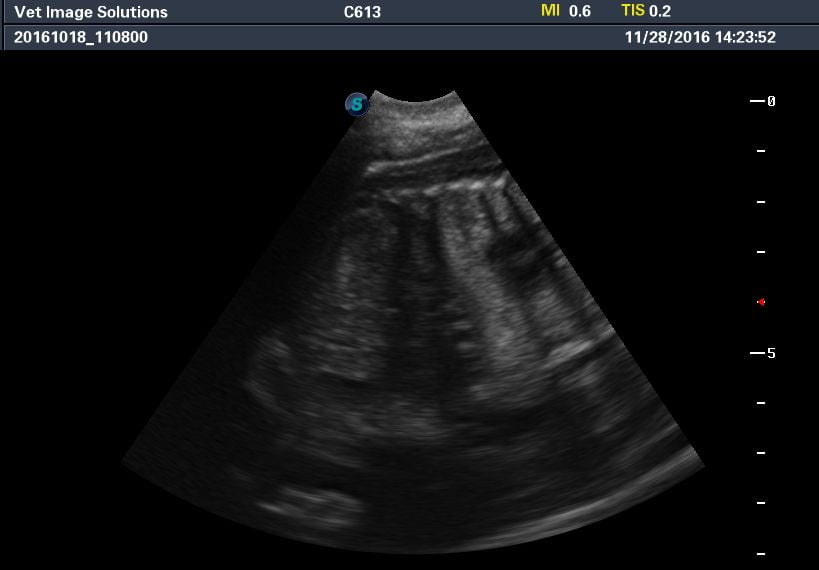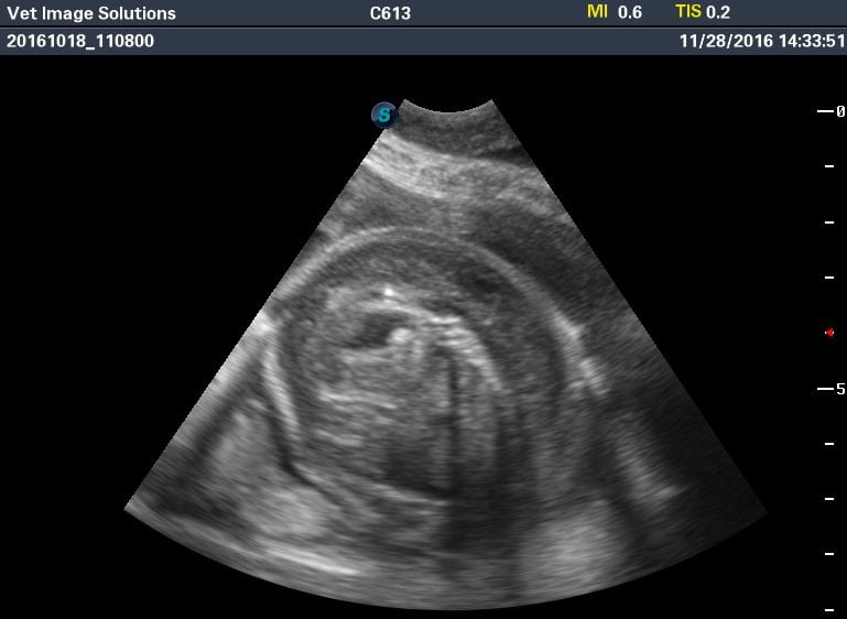 This is a late canine pregnancy scan, on a bulldog in Croydon (due within the next 7 days). Acoustic shadows are now being cast from the solidified bone of the puppies’ rib cages, and the four chambers of the foetal hearts can be clearly seen.