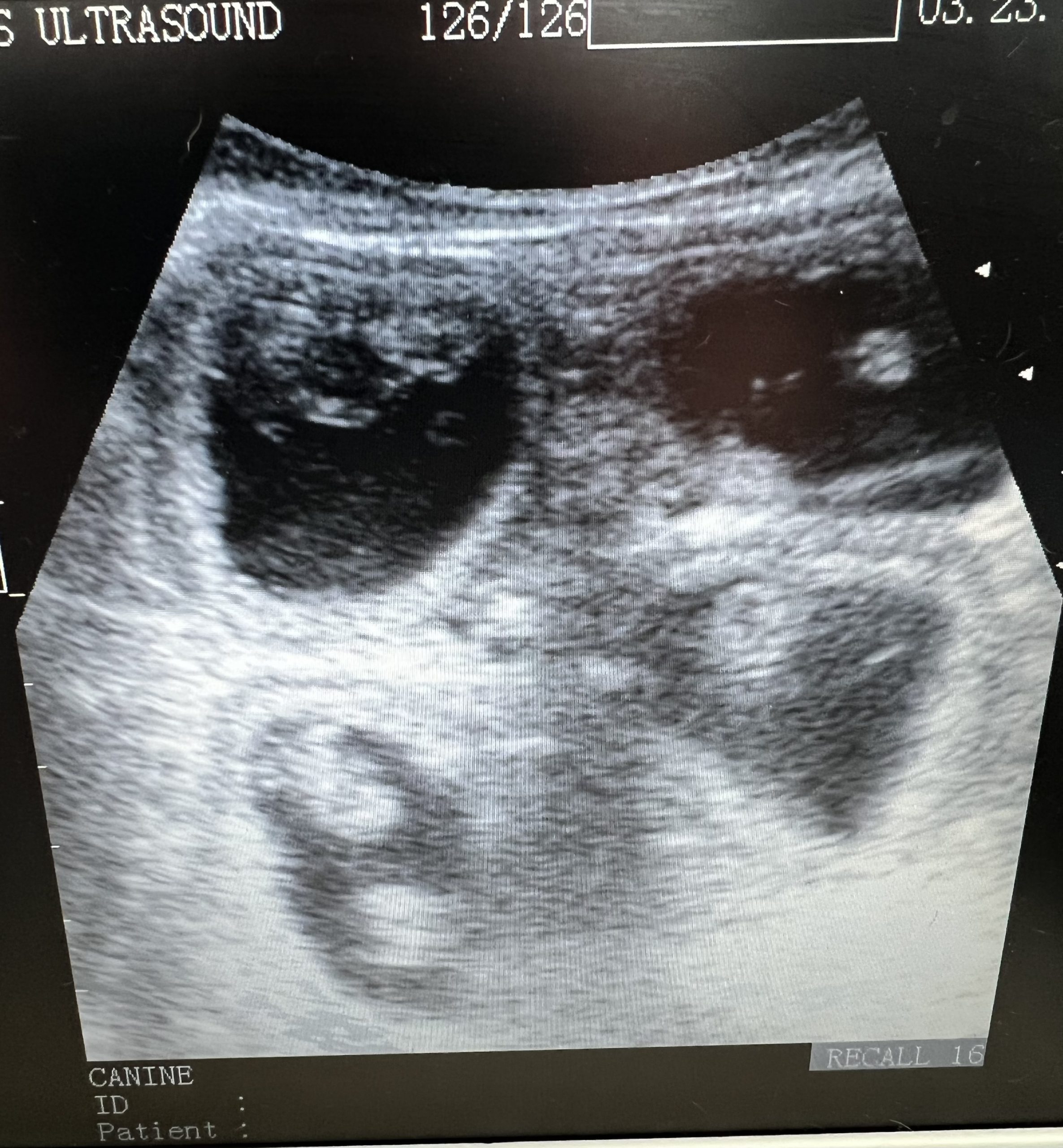 First scan to confirm pregnancy. Very young dog which arrived with its new owner already pregnant so we are monitoring her progress with weekly scanning.