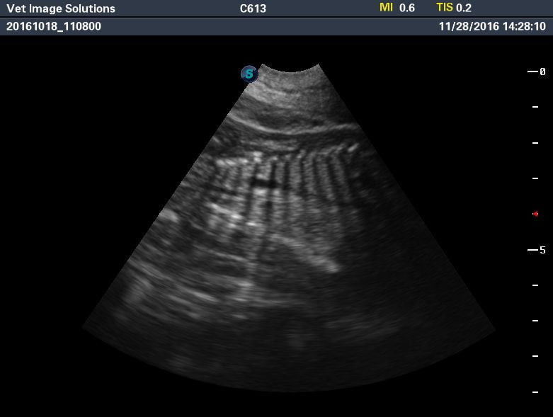 Canine pregnancy scan of a Chihuahua in Bromley. Scanned at approximately 40 days. You can clearly see that bone ossification has begun.