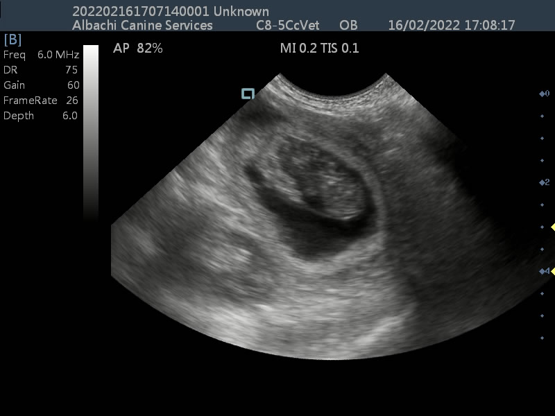 First scan to confirm pregnancy. Very young dog which arrived with its new owner already pregnant so we are monitoring her progress with weekly scanning.